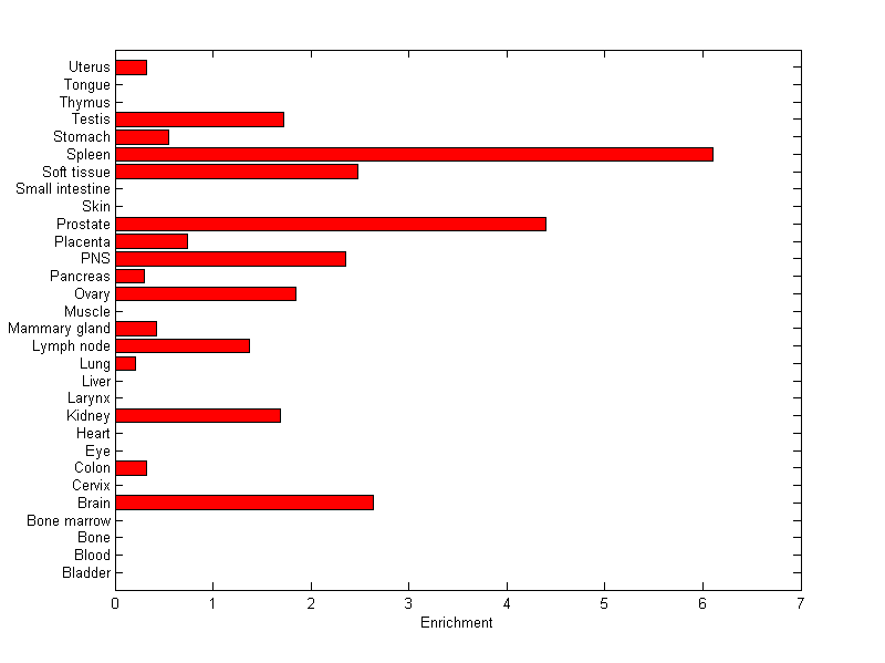 The expression level is normalized with tissue-library size. Each value for a gene in a tissue is a ratio of observed ESTs to the expected one in this tissue. The expected number of ESTs is the product of total ESTs of the gene and the fraction of total ESTs in the tissue among all ESTs in 30 tissues.
