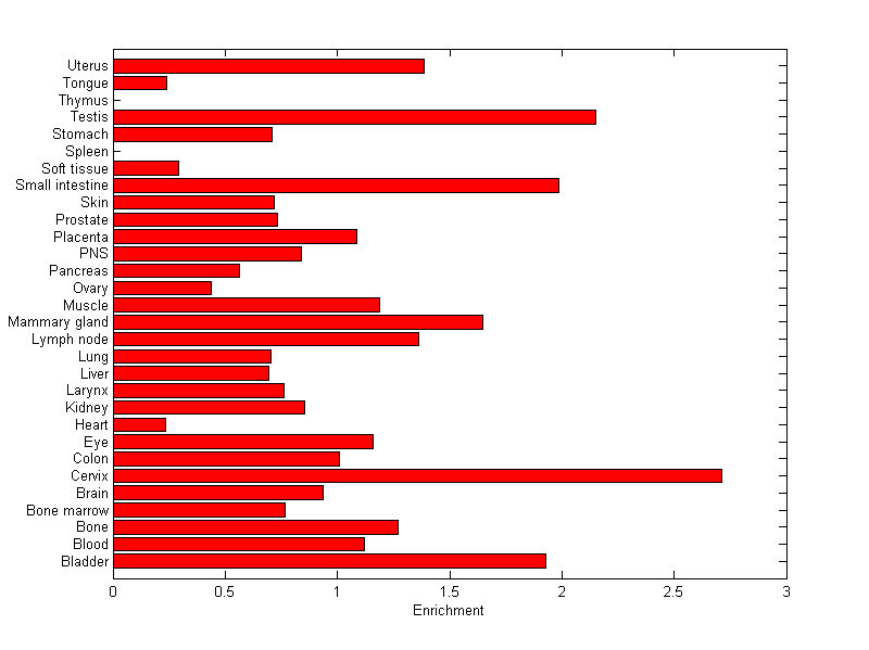 The expression level is normalized with tissue-library size. Each value for a gene in a tissue is a ratio of observed ESTs to the expected one in this tissue. The expected number of ESTs is the product of total ESTs of the gene and the fraction of total ESTs in the tissue among all ESTs in 30 tissues.