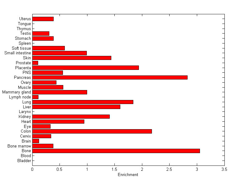 The expression level is normalized with tissue-library size. Each value for a gene in a tissue is a ratio of observed ESTs to the expected one in this tissue. The expected number of ESTs is the product of total ESTs of the gene and the fraction of total ESTs in the tissue among all ESTs in 30 tissues.