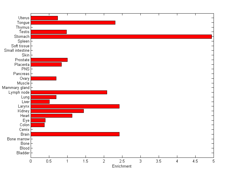 The expression level is normalized with tissue-library size. Each value for a gene in a tissue is a ratio of observed ESTs to the expected one in this tissue. The expected number of ESTs is the product of total ESTs of the gene and the fraction of total ESTs in the tissue among all ESTs in 30 tissues.