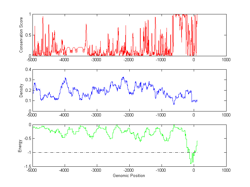 The energy profile (green curve) is about energy for module detection based on TF interaction. The positions with energy less than -1 indicate the existence of CRMs.