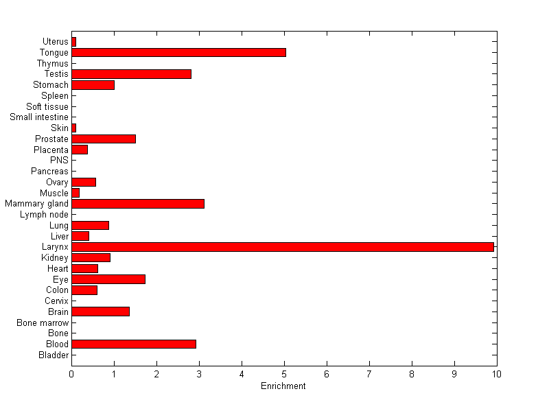 The expression level is normalized with tissue-library size. Each value for a gene in a tissue is a ratio of observed ESTs to the expected one in this tissue. The expected number of ESTs is the product of total ESTs of the gene and the fraction of total ESTs in the tissue among all ESTs in 30 tissues.