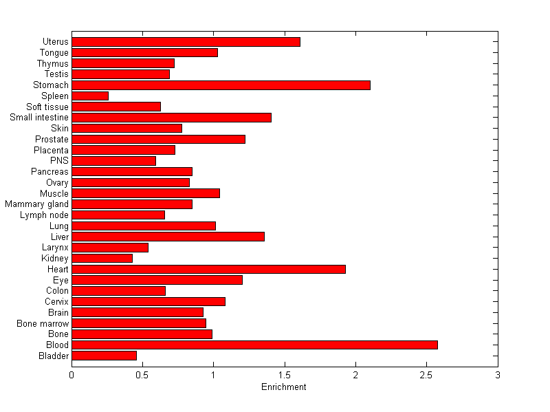 The expression level is normalized with tissue-library size. Each value for a gene in a tissue is a ratio of observed ESTs to the expected one in this tissue. The expected number of ESTs is the product of total ESTs of the gene and the fraction of total ESTs in the tissue among all ESTs in 30 tissues.