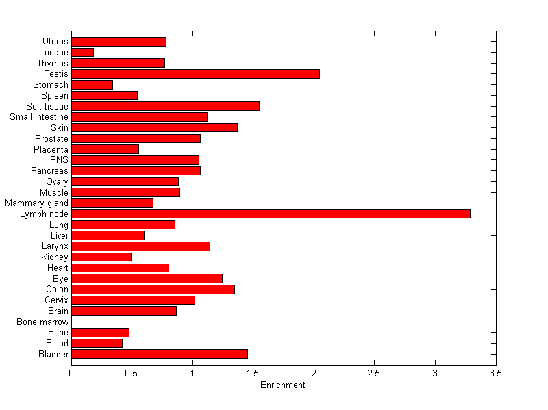 The expression level is normalized with tissue-library size. Each value for a gene in a tissue is a ratio of observed ESTs to the expected one in this tissue. The expected number of ESTs is the product of total ESTs of the gene and the fraction of total ESTs in the tissue among all ESTs in 30 tissues.