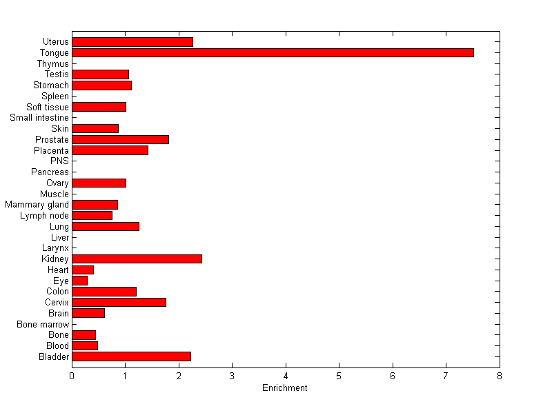 The expression level is normalized with tissue-library size. Each value for a gene in a tissue is a ratio of observed ESTs to the expected one in this tissue. The expected number of ESTs is the product of total ESTs of the gene and the fraction of total ESTs in the tissue among all ESTs in 30 tissues.