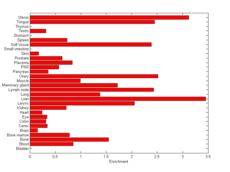 The expression level is normalized with tissue-library size. Each value for a gene in a tissue is a ratio of observed ESTs to the expected one in this tissue. The expected number of ESTs is the product of total ESTs of the gene and the fraction of total ESTs in the tissue among all ESTs in 30 tissues.