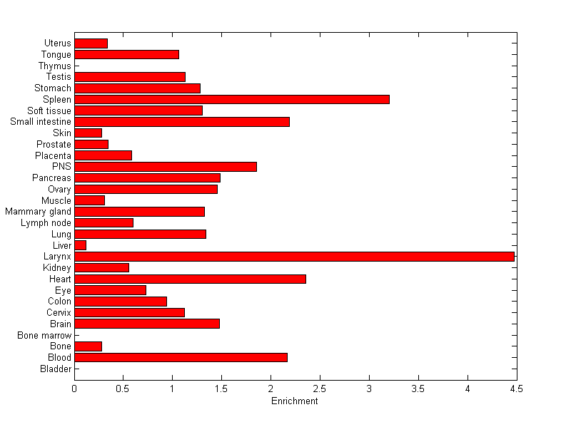 The expression level is normalized with tissue-library size. Each value for a gene in a tissue is a ratio of observed ESTs to the expected one in this tissue. The expected number of ESTs is the product of total ESTs of the gene and the fraction of total ESTs in the tissue among all ESTs in 30 tissues.
