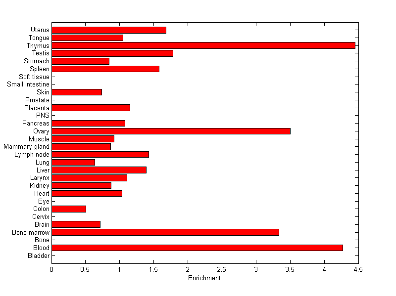 The expression level is normalized with tissue-library size. Each value for a gene in a tissue is a ratio of observed ESTs to the expected one in this tissue. The expected number of ESTs is the product of total ESTs of the gene and the fraction of total ESTs in the tissue among all ESTs in 30 tissues.