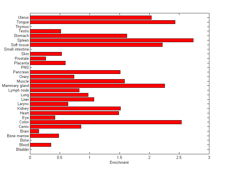 The expression level is normalized with tissue-library size. Each value for a gene in a tissue is a ratio of observed ESTs to the expected one in this tissue. The expected number of ESTs is the product of total ESTs of the gene and the fraction of total ESTs in the tissue among all ESTs in 30 tissues.