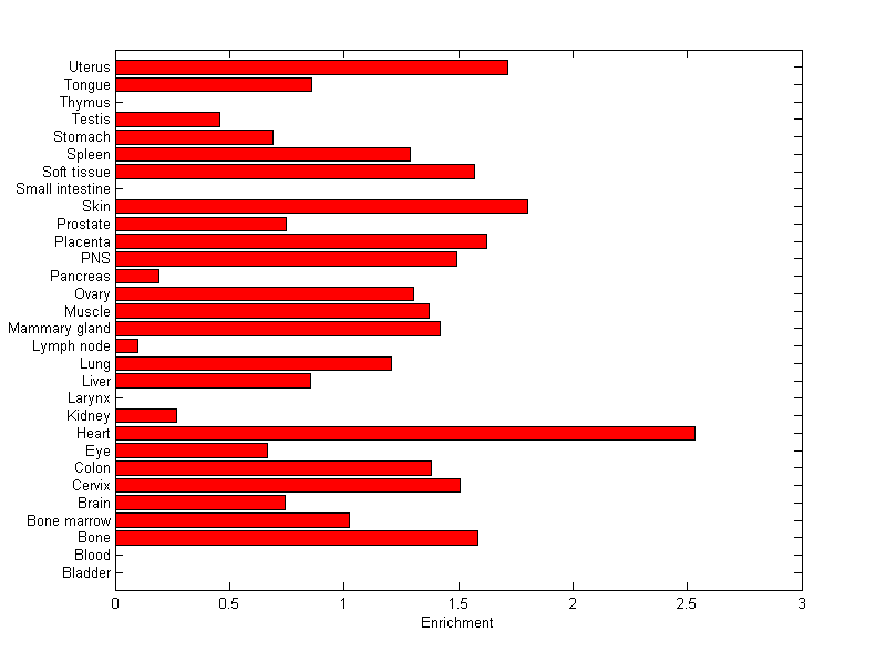 The expression level is normalized with tissue-library size. Each value for a gene in a tissue is a ratio of observed ESTs to the expected one in this tissue. The expected number of ESTs is the product of total ESTs of the gene and the fraction of total ESTs in the tissue among all ESTs in 30 tissues.