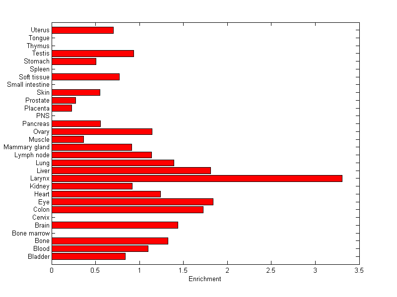 The expression level is normalized with tissue-library size. Each value for a gene in a tissue is a ratio of observed ESTs to the expected one in this tissue. The expected number of ESTs is the product of total ESTs of the gene and the fraction of total ESTs in the tissue among all ESTs in 30 tissues.