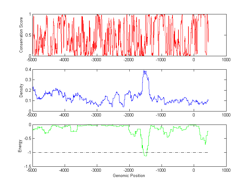 The energy profile (green curve) is about energy for module detection based on TF interaction. The positions with energy less than -1 indicate the existence of CRMs.