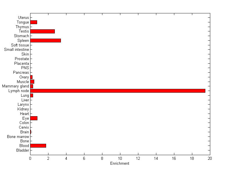 The expression level is normalized with tissue-library size. Each value for a gene in a tissue is a ratio of observed ESTs to the expected one in this tissue. The expected number of ESTs is the product of total ESTs of the gene and the fraction of total ESTs in the tissue among all ESTs in 30 tissues.