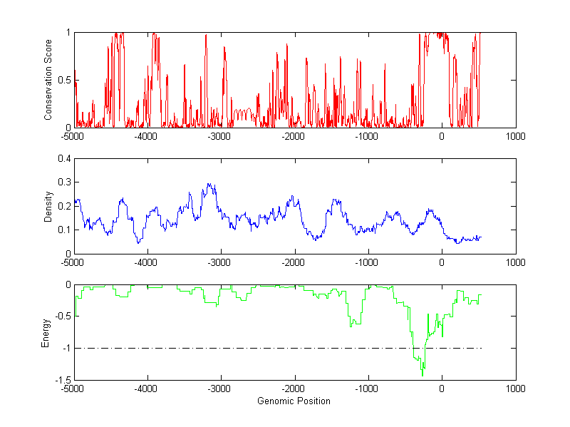 The energy profile (green curve) is about energy for module detection based on TF interaction. The positions with energy less than -1 indicate the existence of CRMs.