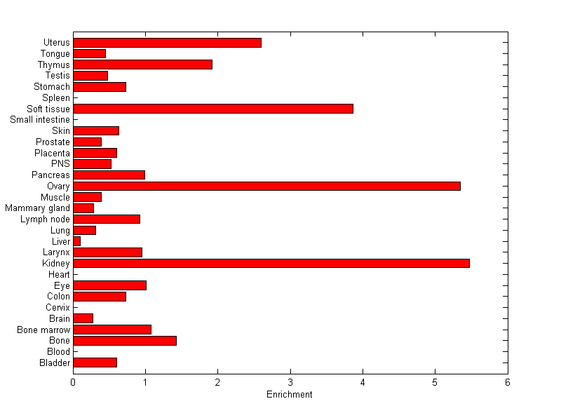 The expression level is normalized with tissue-library size. Each value for a gene in a tissue is a ratio of observed ESTs to the expected one in this tissue. The expected number of ESTs is the product of total ESTs of the gene and the fraction of total ESTs in the tissue among all ESTs in 30 tissues.