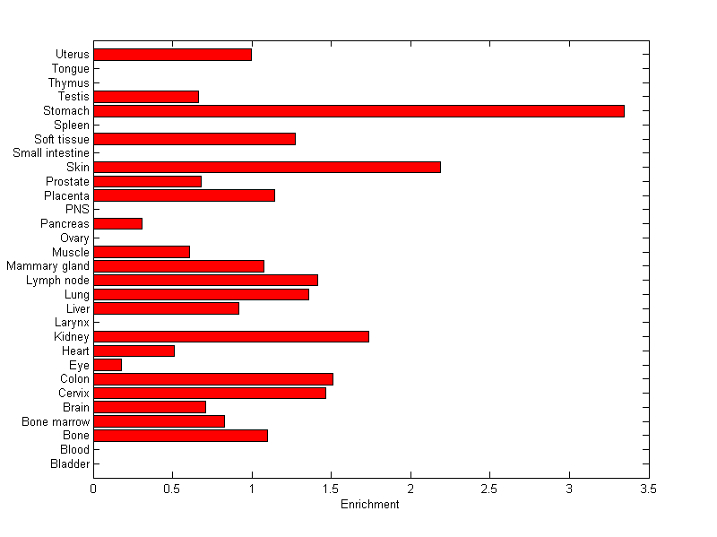 The expression level is normalized with tissue-library size. Each value for a gene in a tissue is a ratio of observed ESTs to the expected one in this tissue. The expected number of ESTs is the product of total ESTs of the gene and the fraction of total ESTs in the tissue among all ESTs in 30 tissues.