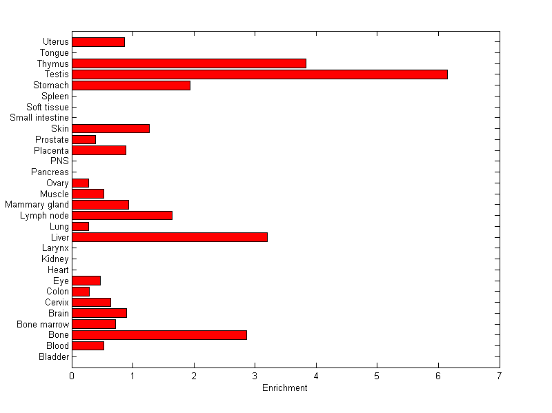 The expression level is normalized with tissue-library size. Each value for a gene in a tissue is a ratio of observed ESTs to the expected one in this tissue. The expected number of ESTs is the product of total ESTs of the gene and the fraction of total ESTs in the tissue among all ESTs in 30 tissues.