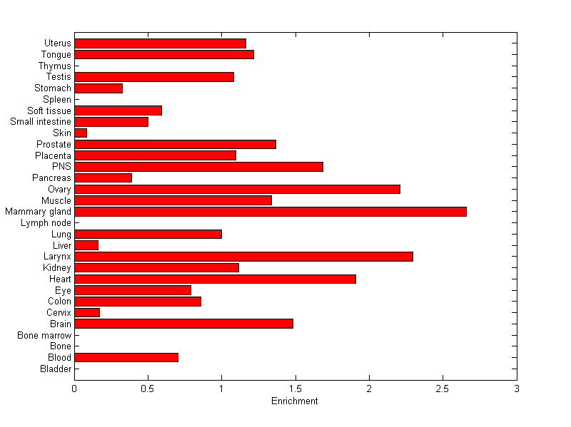 The expression level is normalized with tissue-library size. Each value for a gene in a tissue is a ratio of observed ESTs to the expected one in this tissue. The expected number of ESTs is the product of total ESTs of the gene and the fraction of total ESTs in the tissue among all ESTs in 30 tissues.