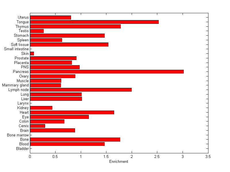 The expression level is normalized with tissue-library size. Each value for a gene in a tissue is a ratio of observed ESTs to the expected one in this tissue. The expected number of ESTs is the product of total ESTs of the gene and the fraction of total ESTs in the tissue among all ESTs in 30 tissues.