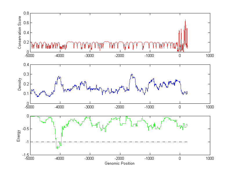 The energy profile (green curve) is about energy for module detection based on TF interaction. The positions with energy less than -1 indicate the existence of CRMs.