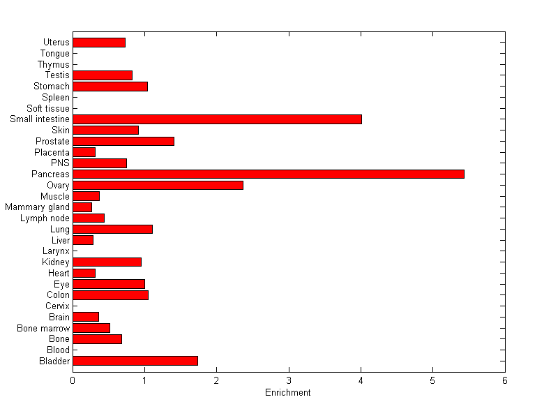 The expression level is normalized with tissue-library size. Each value for a gene in a tissue is a ratio of observed ESTs to the expected one in this tissue. The expected number of ESTs is the product of total ESTs of the gene and the fraction of total ESTs in the tissue among all ESTs in 30 tissues.