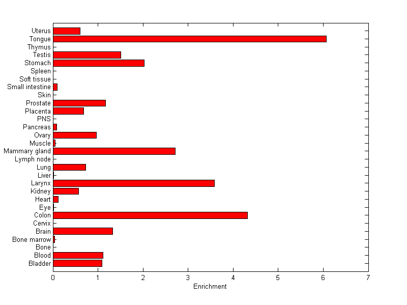 The expression level is normalized with tissue-library size. Each value for a gene in a tissue is a ratio of observed ESTs to the expected one in this tissue. The expected number of ESTs is the product of total ESTs of the gene and the fraction of total ESTs in the tissue among all ESTs in 30 tissues.
