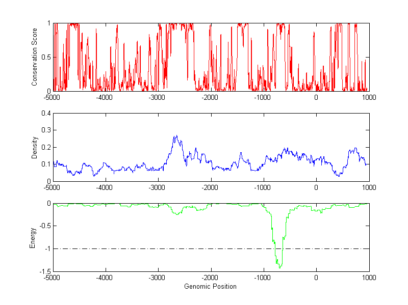 The energy profile (green curve) is about energy for module detection based on TF interaction. The positions with energy less than -1 indicate the existence of CRMs.