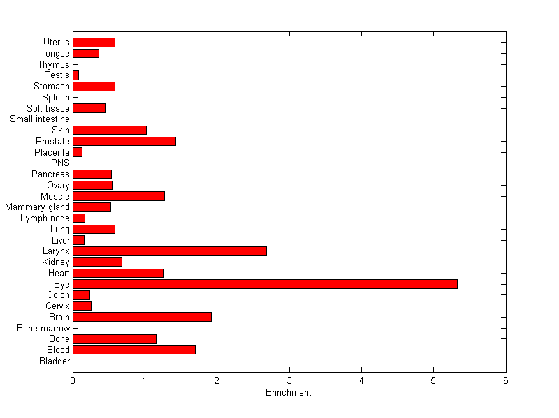 The expression level is normalized with tissue-library size. Each value for a gene in a tissue is a ratio of observed ESTs to the expected one in this tissue. The expected number of ESTs is the product of total ESTs of the gene and the fraction of total ESTs in the tissue among all ESTs in 30 tissues.