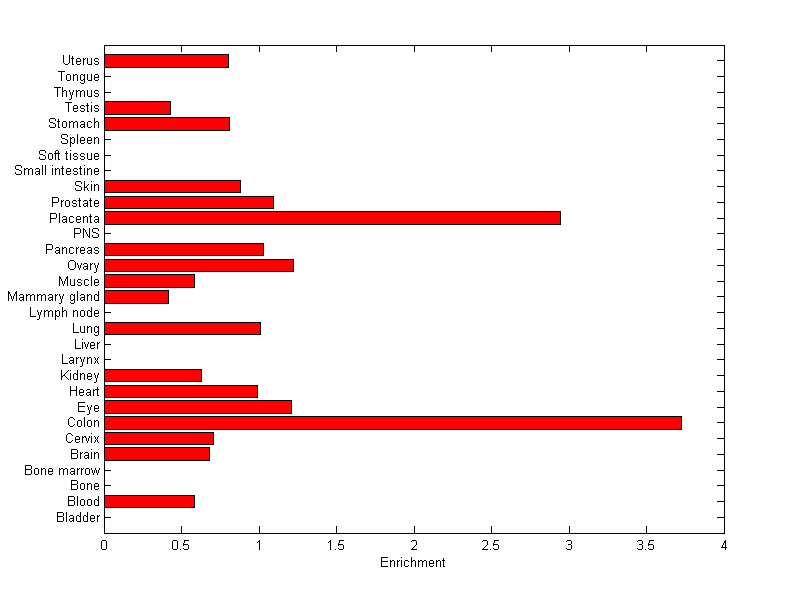 The expression level is normalized with tissue-library size. Each value for a gene in a tissue is a ratio of observed ESTs to the expected one in this tissue. The expected number of ESTs is the product of total ESTs of the gene and the fraction of total ESTs in the tissue among all ESTs in 30 tissues.