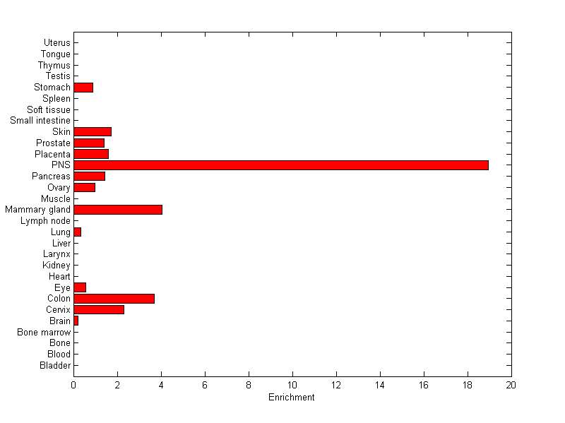 About the profile: The expression level is normalized with tissue-library size. Each value for a gene in a tissue is a ratio of observed ESTs to the expected one in this tissue. The expected number of ESTs is the product of total ESTs of the gene and the fraction of total ESTs in the tissue among all ESTs in 30 tissues. Summary: This gene is preferentially expressed in [peripheral_nervous_system] Download: |