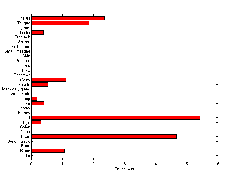 The expression level is normalized with tissue-library size. Each value for a gene in a tissue is a ratio of observed ESTs to the expected one in this tissue. The expected number of ESTs is the product of total ESTs of the gene and the fraction of total ESTs in the tissue among all ESTs in 30 tissues.