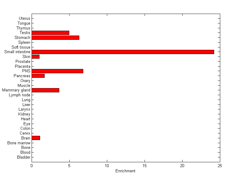 The expression level is normalized with tissue-library size. Each value for a gene in a tissue is a ratio of observed ESTs to the expected one in this tissue. The expected number of ESTs is the product of total ESTs of the gene and the fraction of total ESTs in the tissue among all ESTs in 30 tissues.