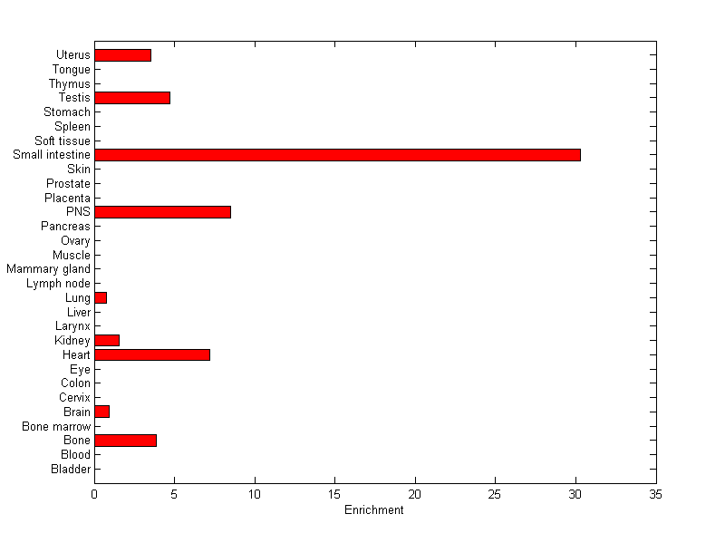 The expression level is normalized with tissue-library size. Each value for a gene in a tissue is a ratio of observed ESTs to the expected one in this tissue. The expected number of ESTs is the product of total ESTs of the gene and the fraction of total ESTs in the tissue among all ESTs in 30 tissues.