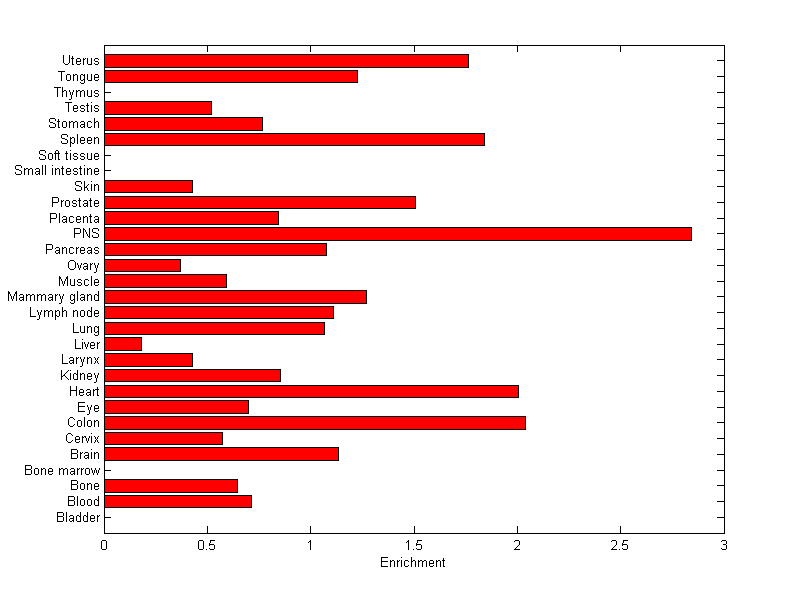 The expression level is normalized with tissue-library size. Each value for a gene in a tissue is a ratio of observed ESTs to the expected one in this tissue. The expected number of ESTs is the product of total ESTs of the gene and the fraction of total ESTs in the tissue among all ESTs in 30 tissues.