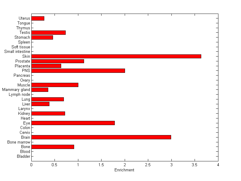 The expression level is normalized with tissue-library size. Each value for a gene in a tissue is a ratio of observed ESTs to the expected one in this tissue. The expected number of ESTs is the product of total ESTs of the gene and the fraction of total ESTs in the tissue among all ESTs in 30 tissues.