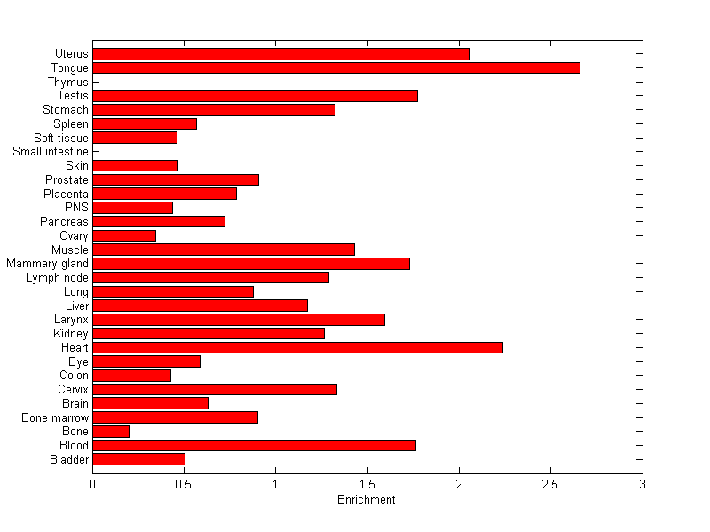 The expression level is normalized with tissue-library size. Each value for a gene in a tissue is a ratio of observed ESTs to the expected one in this tissue. The expected number of ESTs is the product of total ESTs of the gene and the fraction of total ESTs in the tissue among all ESTs in 30 tissues.