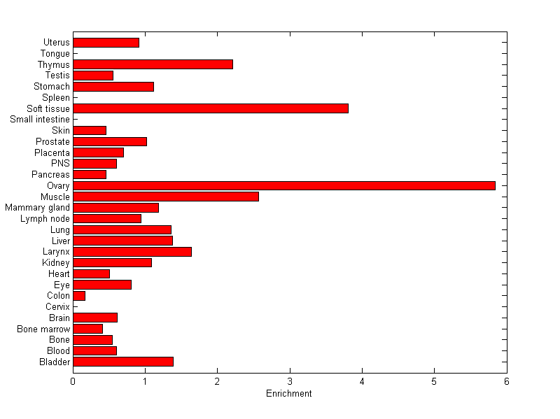 The expression level is normalized with tissue-library size. Each value for a gene in a tissue is a ratio of observed ESTs to the expected one in this tissue. The expected number of ESTs is the product of total ESTs of the gene and the fraction of total ESTs in the tissue among all ESTs in 30 tissues.