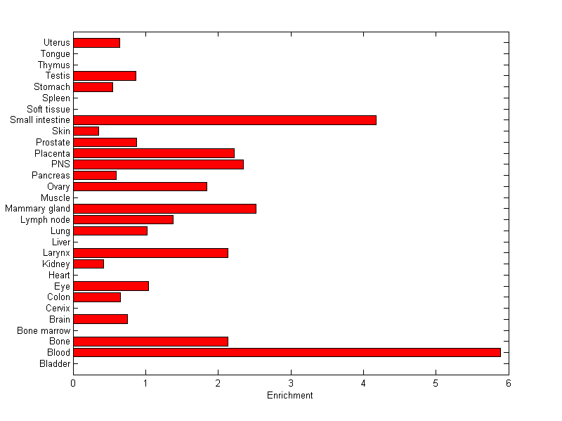 The expression level is normalized with tissue-library size. Each value for a gene in a tissue is a ratio of observed ESTs to the expected one in this tissue. The expected number of ESTs is the product of total ESTs of the gene and the fraction of total ESTs in the tissue among all ESTs in 30 tissues.