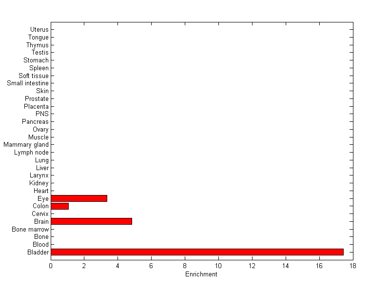 The expression level is normalized with tissue-library size. Each value for a gene in a tissue is a ratio of observed ESTs to the expected one in this tissue. The expected number of ESTs is the product of total ESTs of the gene and the fraction of total ESTs in the tissue among all ESTs in 30 tissues.
