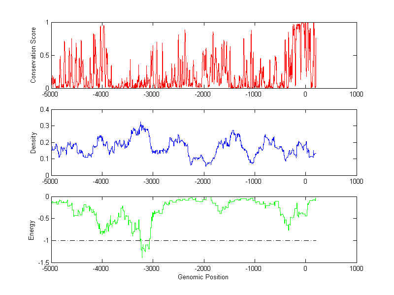The energy profile (green curve) is about energy for module detection based on TF interaction. The positions with energy less than -1 indicate the existence of CRMs.