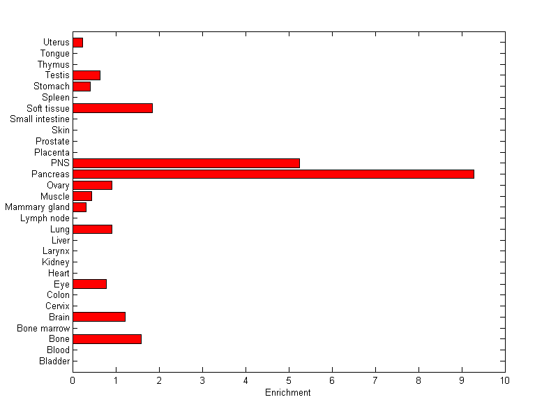The expression level is normalized with tissue-library size. Each value for a gene in a tissue is a ratio of observed ESTs to the expected one in this tissue. The expected number of ESTs is the product of total ESTs of the gene and the fraction of total ESTs in the tissue among all ESTs in 30 tissues.