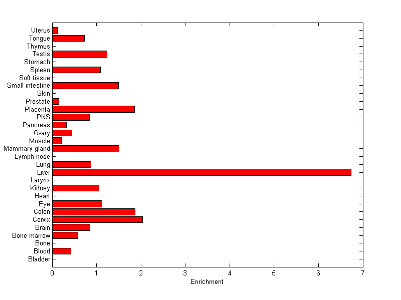 The expression level is normalized with tissue-library size. Each value for a gene in a tissue is a ratio of observed ESTs to the expected one in this tissue. The expected number of ESTs is the product of total ESTs of the gene and the fraction of total ESTs in the tissue among all ESTs in 30 tissues.