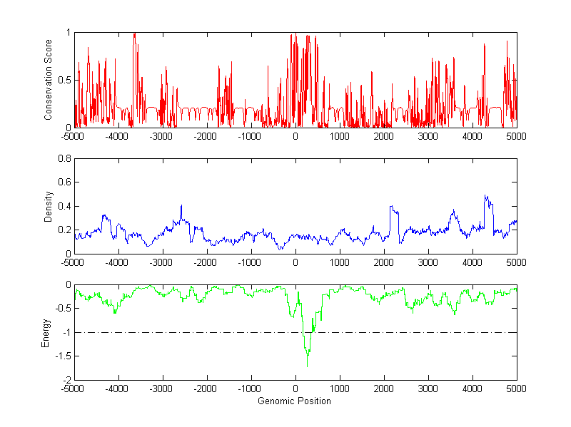The energy profile (green curve) is about energy for module detection based on TF interaction. The positions with energy less than -1 indicate the existence of CRMs.