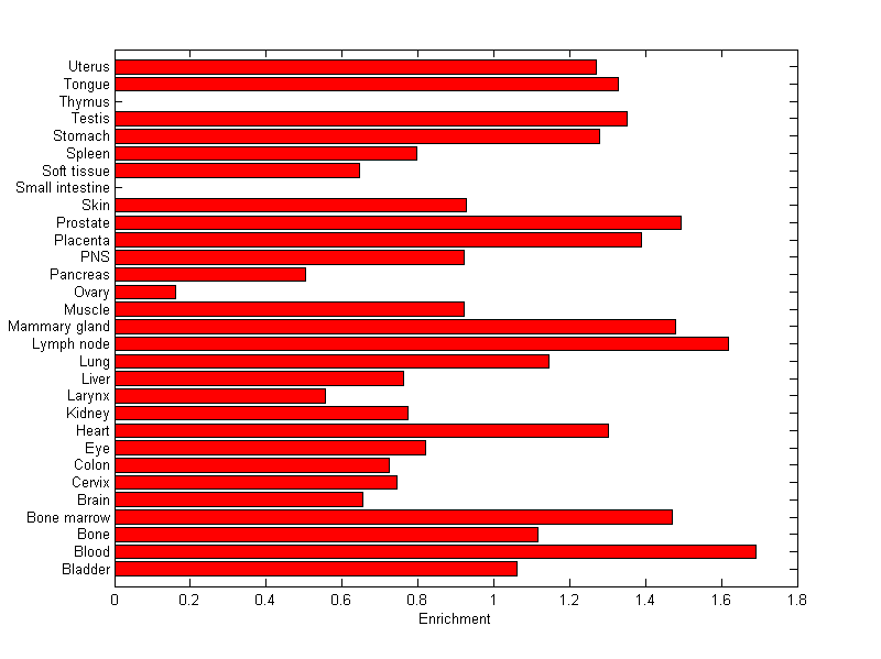 The expression level is normalized with tissue-library size. Each value for a gene in a tissue is a ratio of observed ESTs to the expected one in this tissue. The expected number of ESTs is the product of total ESTs of the gene and the fraction of total ESTs in the tissue among all ESTs in 30 tissues.