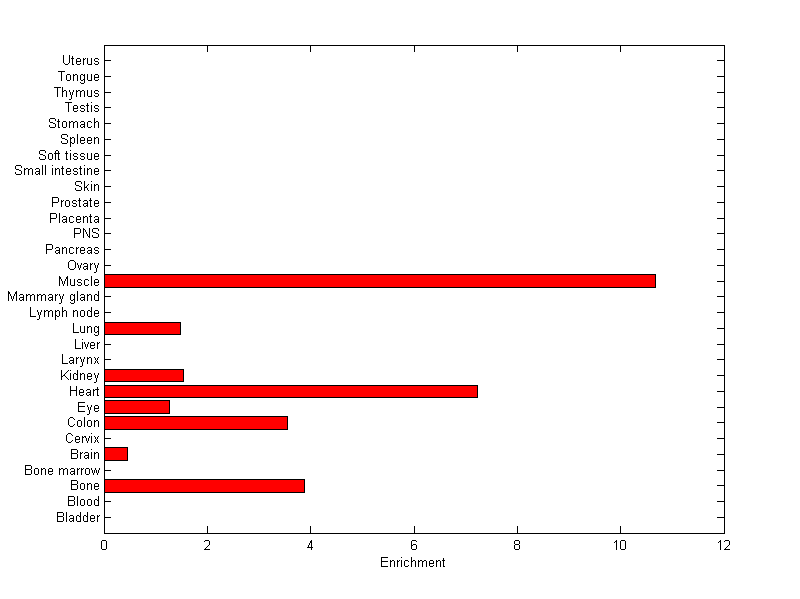 The expression level is normalized with tissue-library size. Each value for a gene in a tissue is a ratio of observed ESTs to the expected one in this tissue. The expected number of ESTs is the product of total ESTs of the gene and the fraction of total ESTs in the tissue among all ESTs in 30 tissues.