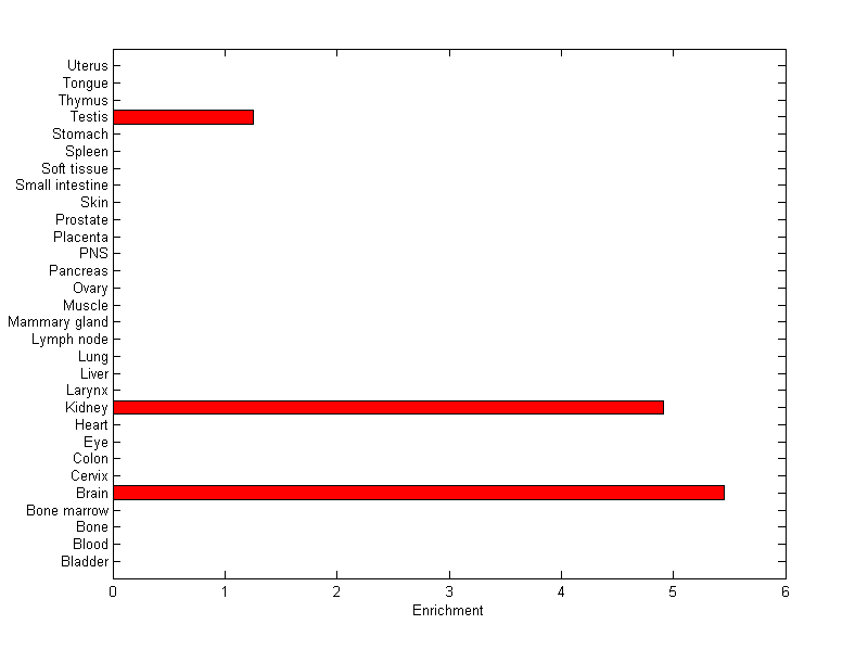 The expression level is normalized with tissue-library size. Each value for a gene in a tissue is a ratio of observed ESTs to the expected one in this tissue. The expected number of ESTs is the product of total ESTs of the gene and the fraction of total ESTs in the tissue among all ESTs in 30 tissues.