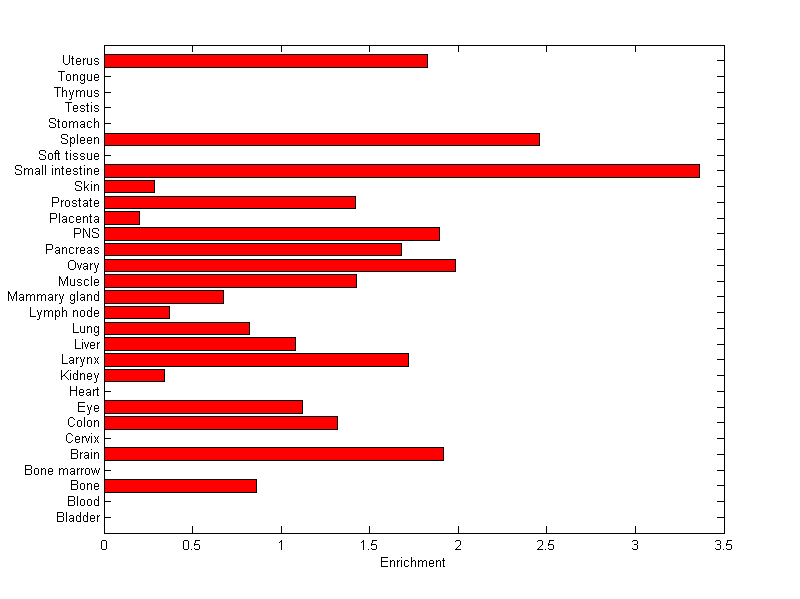The expression level is normalized with tissue-library size. Each value for a gene in a tissue is a ratio of observed ESTs to the expected one in this tissue. The expected number of ESTs is the product of total ESTs of the gene and the fraction of total ESTs in the tissue among all ESTs in 30 tissues.