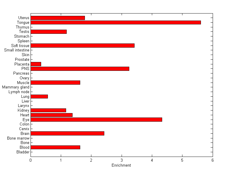 The expression level is normalized with tissue-library size. Each value for a gene in a tissue is a ratio of observed ESTs to the expected one in this tissue. The expected number of ESTs is the product of total ESTs of the gene and the fraction of total ESTs in the tissue among all ESTs in 30 tissues.