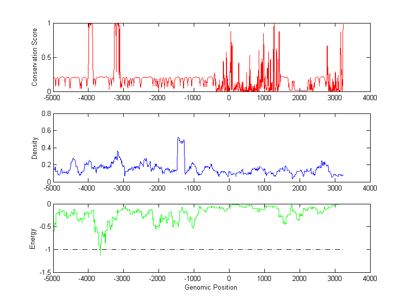 The energy profile (green curve) is about energy for module detection based on TF interaction. The positions with energy less than -1 indicate the existence of CRMs.