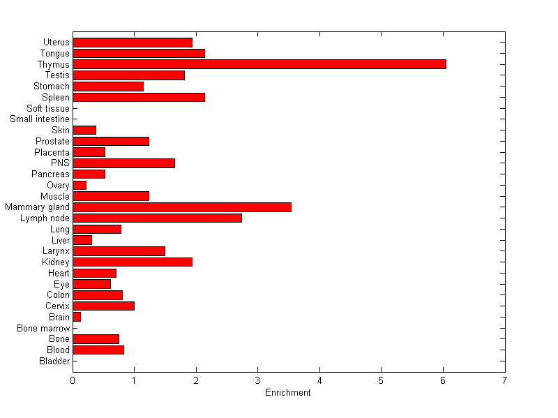 The expression level is normalized with tissue-library size. Each value for a gene in a tissue is a ratio of observed ESTs to the expected one in this tissue. The expected number of ESTs is the product of total ESTs of the gene and the fraction of total ESTs in the tissue among all ESTs in 30 tissues.